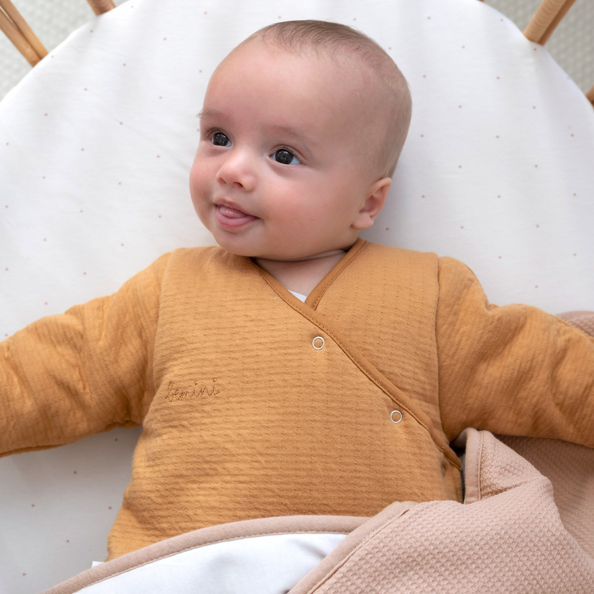 Dank der geknoteten Bänder kann er einfach und sicher an den Stäben befestigt werden. Die speziell angepasste Watte sorgt für seinen Komfort und Halt. Um jegliches Risiko des Kletterns zu vermeiden, ist er so konzipiert, dass er unter dem Gewicht des Babys zusammengedrückt werden kann.