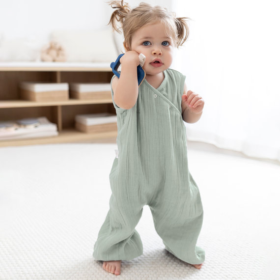 Die getrennten Beine ermöglichen es Baby in der Babytrage, der Wippe und dem Hochstuhl zu sitzen oder seine ersten Schritte zu machen.