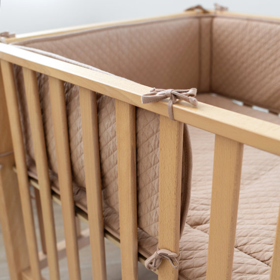 In universeller Größe passt sich der Bettnestchen dem Bett, der Wiege oder dem Laufstall an und ergänzt zärtlich das Universum des Babys.