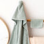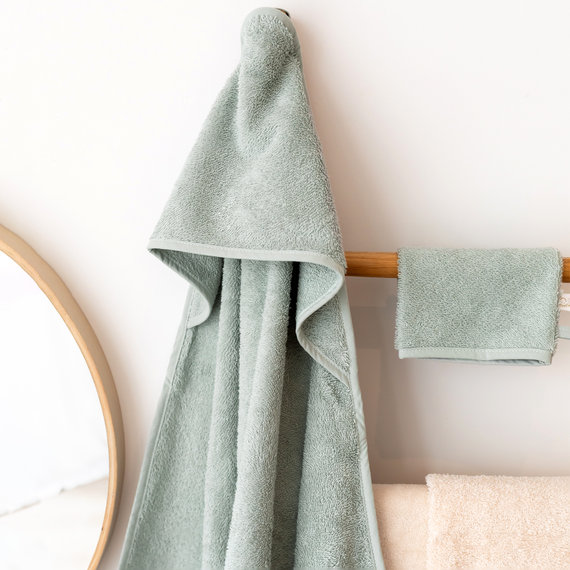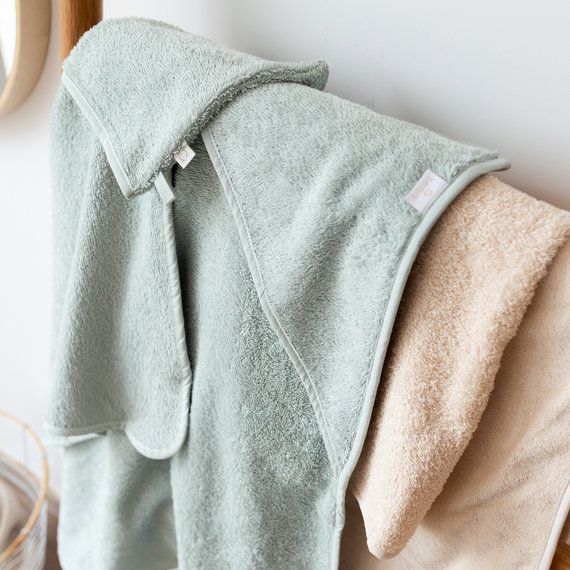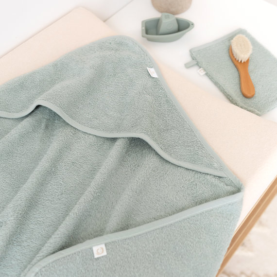 The bath cape wraps baby quickly after a bath and delicately dries all those little nooks and crannies. The hood keeps the head comfortable and warm. The bath towel and matching glove are indispensable from birth onwards.