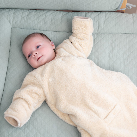 Soft, plush and reversible, the playmat lets baby sit comfortably and safely in the playpen.