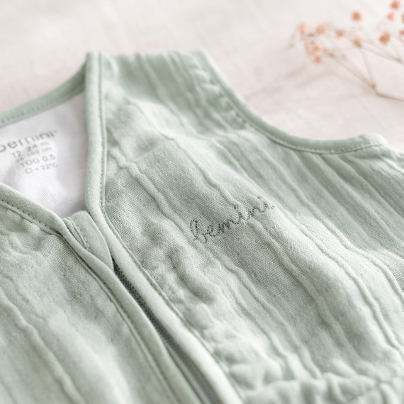 Teder als een streling respecteert de slaapzak van bamboe en katoenen mousseline de gevoelige huid van je baby.